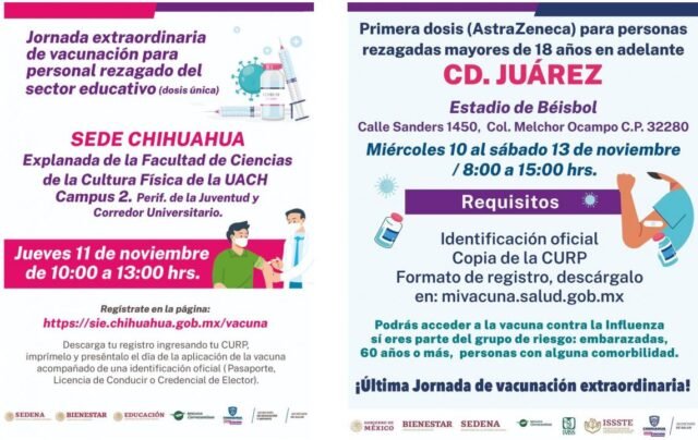 Mientras que en Ciudad Juárez, docentes y personal de apoyo y asistencia a la educación podrán acudir al módulo para población abierta que se instalará en el Gran Estadio Beisbol los días 10, 11 y 12 de noviembre, con previo registro en: https://mivacuna.salud.gob.mx/index.php.