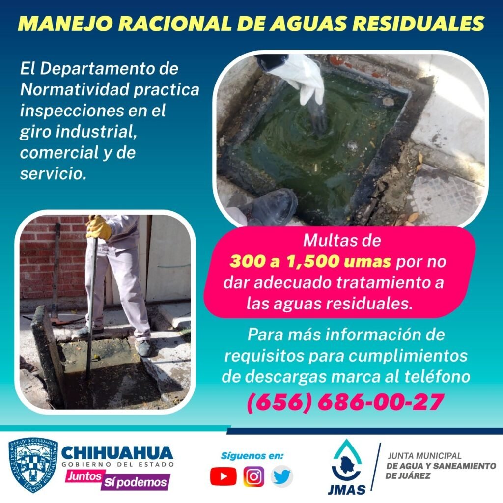 La Junta Municipal de Agua y Saneamiento (JMAS Juárez) a través del departamento de Normatividad, pide a comercios e industrias cuenten con su permiso de descarga de grasas, uso y manejo adecuado del agua residual, para evitar daños al sistema de alcantarillado además de las plantas tratadoras; así mismo para prevenir y controlar la contaminación del agua.