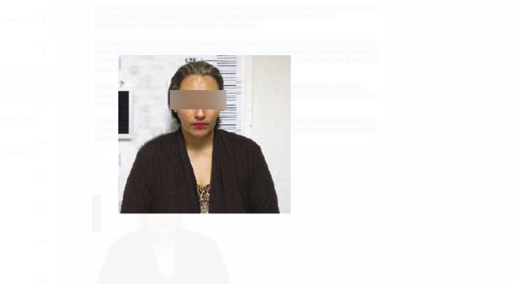 La Fiscalía de Distrito Zona Centro obtuvo un auto de vinculación a proceso, dictado en contra de la imputada Karla Ileana C. G., por el delito de robo agravado, cometido a un establecimiento comercial en la ciudad de Chihuahua.