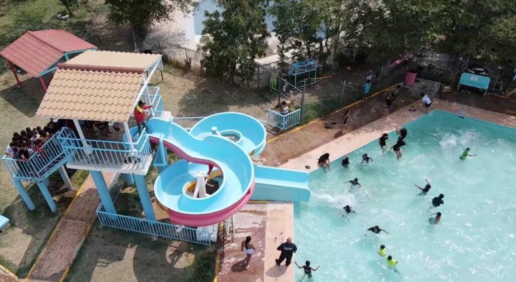 Personal de la Dirección de Prevención Social de la Secretaría de Seguridad Pública Municipal llevó hoy a cerca de 500 niñas, niños y adolescentes que se encuentran inscritos en el campamento de verano que ofrece la SSPM, a las albercas del AquaDIF, para participar en un refrescante día de campo.