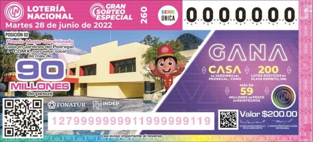 ” El Gran Sorteo Especial No. 260 entregará premios en efectivo y en especie, se realiza en coordinación con el Instituto para Devolver al Pueblo lo Robado (Indep) y el Fondo Nacional de Fomento al Turismo (Fonatur). Entregará más de 59 millones de pesos en 299 mil 999 reintegros con valor de 200 pesos cada uno, y un total de 300 mil 200 premios; se emitieron tres millones de cachitos que ya se encuentran en los más de 12 mil puntos de venta en toda la República mexicana y a través de las plataformas oficiales en lotenal.gob.mx El Gran Sorteo Especial 260 se realizará el martes 28 de junio a las 16:00h y se transmitirá en vivo a través de las redes sociales de la Lotería Nacional.